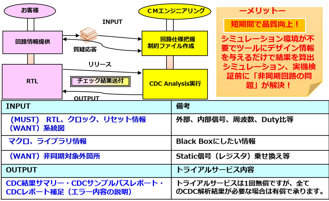 ・(例)過去の設計で問題になった非同期回路がCDCで発見できるのか確認したい方や、CDC解析に興味があるが、ツール評価の時間が取れない方等